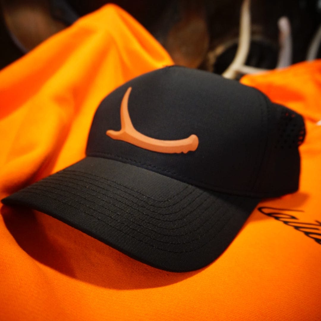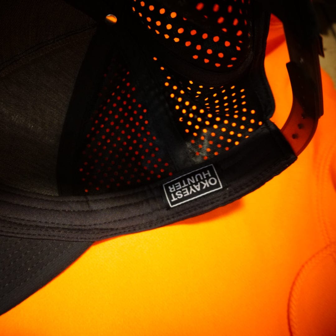 This black cap with a blaze orange Okayest Hunter antler emblem carries the spirit of last light and the camaraderie that comes after it. With athletic mesh webbing in the back, it keeps you cool during the grind and comfortable by the fire. The signature Okayest Hunter tag and internal woven label remind you why you’re really out there — not for perfection, but for the stories, the laughs, and the ones that got away.